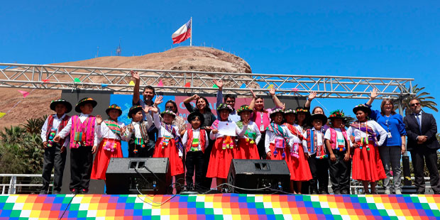 La plaza Vicuña Mackenna se vistió de colores, alegría, música, bailes y poesías donde más de 300 niños y adolescentes fueron los protagonistas en la “Fiesta de las Lenguas Indígenas 2025, Ayllu Arunakan Jach’a Phunchhäwipa 2025”, organizado por la Corporación Nacional de Desarrollo Indígena (Conadi) de Arica y Parinacota.
